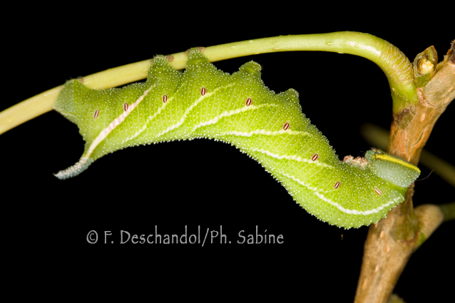 : Sphinx demi-paon (Smerinthus ocellatus atlanticus), chenille 5ème stade, forme verte, Aït-Mhammed, Maroc.