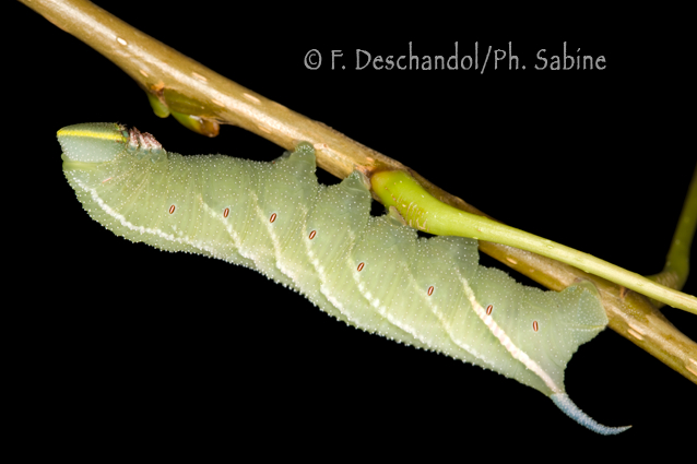: Sphinx demi-paon (Smerinthus ocellatus atlanticus), chenille 5ème stade, forme gris-bleue, Aït-Mhammed, Maroc.