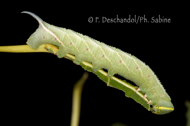 : Sphinx demi-paon (Smerinthus ocellatus atlanticus), chenille 5ème stade, forme gris-bleue, Aït-Mhammed, Maroc.