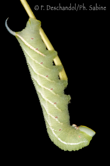 : Sphinx demi-paon (Smerinthus ocellatus atlanticus), chenille 5ème stade, forme gris-bleue, Aït-Mhammed, Maroc.