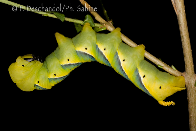 : Sphinx tête de mort (Acherontia atropos), chenille 5ème stade, forme jaune, origine inconnue.