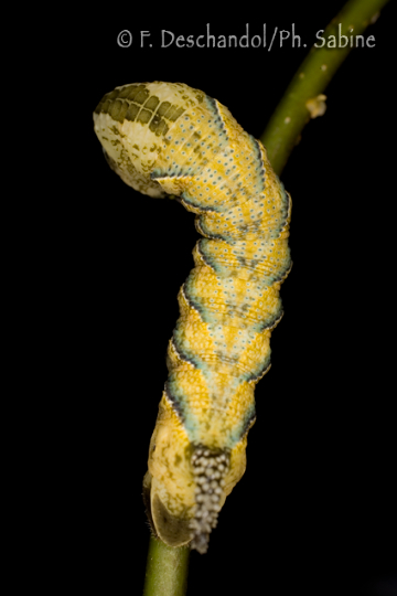 : Sphinx tête de mort (Acherontia atropos), chenille 5ème stade, passage en forme brune juste après la mue, origine inconnue.