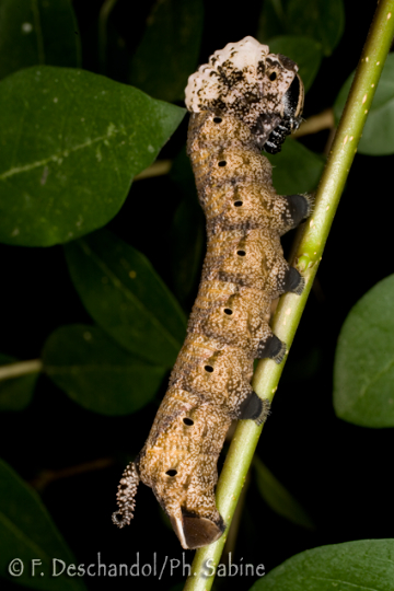 : Sphinx tête de mort (Acherontia atropos), chenille 5ème stade, forme brune, origine inconnue.