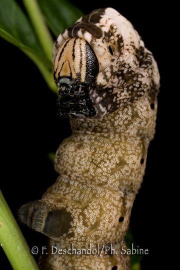 : Sphinx tête de mort (Acherontia atropos), chenille 5ème stade, forme brune, origine inconnue.