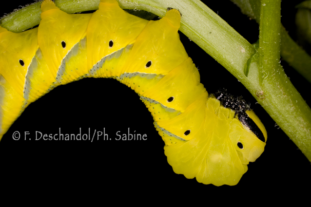 : Sphinx tête de mort (Acherontia atropos), chenille 5ème stade, forme jaune, origine inconnue.