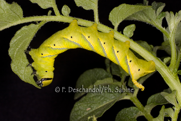 : Sphinx tête de mort (Acherontia atropos), chenille 5ème stade, forme jaune, origine inconnue.