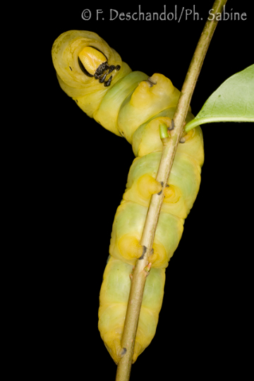 : Sphinx tête de mort (Acherontia atropos), chenille 5ème stade, forme jaune, origine inconnue.
