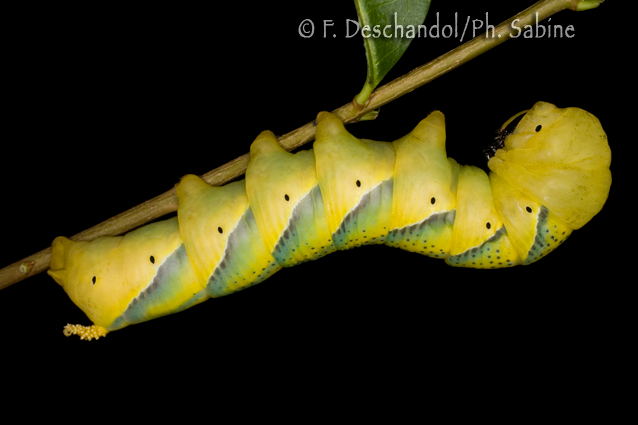 : Sphinx tête de mort (Acherontia atropos), chenille 5ème stade, forme jaune, origine inconnue.