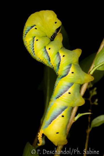 : Sphinx tête de mort (Acherontia atropos), chenille 5ème stade, forme jaune, origine inconnue.