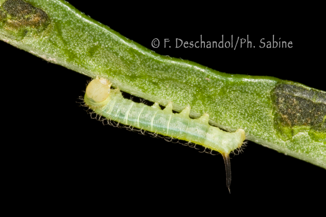 : Macroglosse de Croatie (Hemaris croatica croatica), chenille 1er stade, Dubrovnik, Croatie.