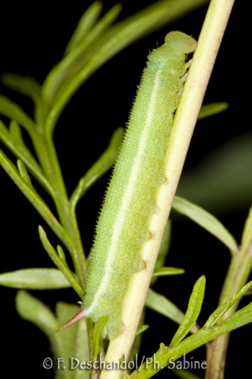 : Macroglosse de Croatie (Hemaris croatica croatica), chenille 3ème stade, mue proche, Dubrovnik, Croatie.