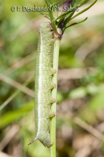 : Macroglosse de Croatie (Hemaris croatica croatica), chenille 5ème stade, forme verte, Dubrovnik, Croatie.