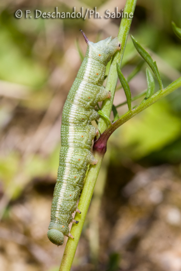 : Macroglosse de Croatie (Hemaris croatica croatica), chenille 5ème stade, forme verte, Dubrovnik, Croatie.