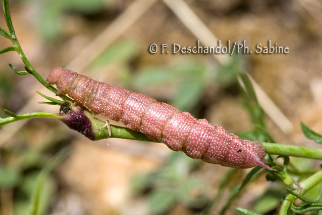 : Macroglosse de Croatie (Hemaris croatica croatica), chenille 5ème stade, forme rose, Dubrovnik, Croatie.