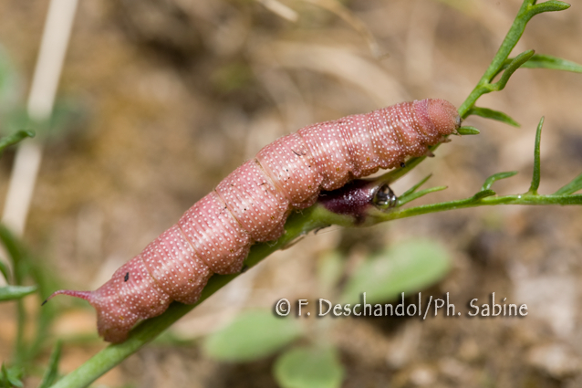 : Macroglosse de Croatie (Hemaris croatica croatica), chenille 5ème stade, forme rose, Dubrovnik, Croatie.