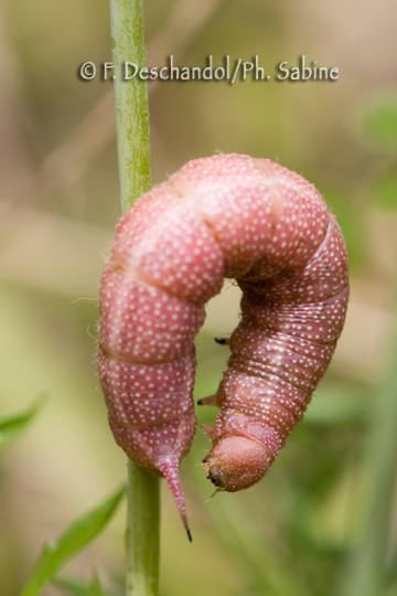 : Macroglosse de Croatie (Hemaris croatica croatica), chenille 5ème stade, forme rose, Dubrovnik, Croatie.