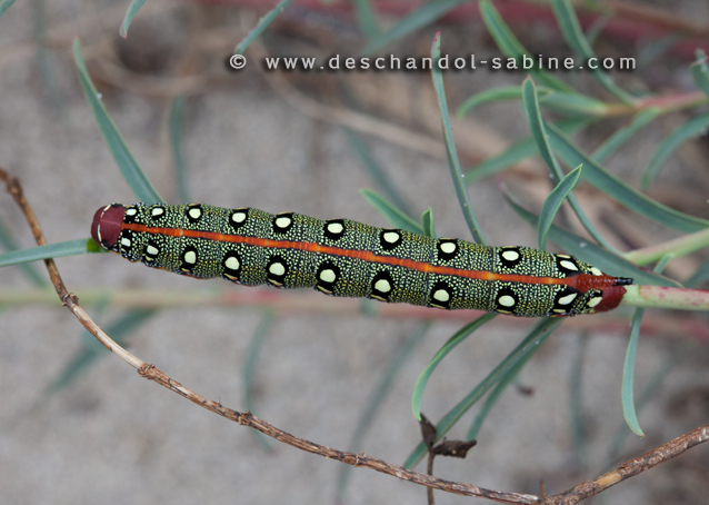 : (Hyles dahlii), chenille 4ème stade, Minorque, Baléares, Espagne.