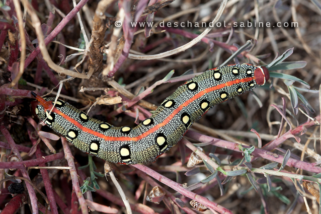 : (Hyles dahlii), chenille 5ème stade, Minorque, Baléares, Espagne.
