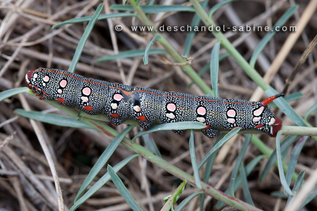 : (Hyles dahlii), chenille 5ème stade, Minorque, Baléares, Espagne.