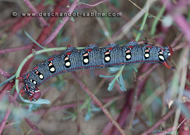 : (Hyles dahlii), chenille 5ème stade, Minorque, Baléares, Espagne.