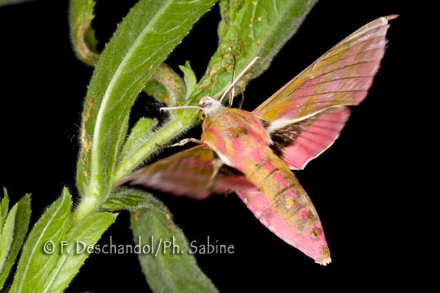 : Grand Sphinx de la Vigne (Deilephila elpenor), femelle cherchant à pondre, Baie de Seine (76), France.