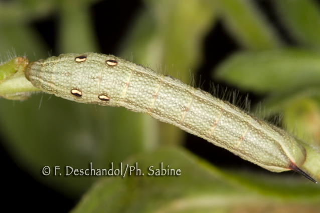 : Grand Sphinx de la Vigne (Deilephila elpenor), chenille 3ème stade, forme olive, Rogerville (76), France.