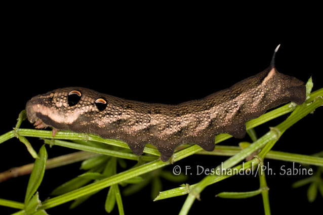 : Grand Sphinx de la Vigne (Deilephila elpenor), chenille 4ème stade, forme brune, Elevage.