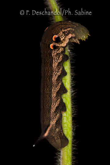 : Grand Sphinx de la Vigne (Deilephila elpenor), chenille 4ème stade, forme brune, Rogerville (76), France.