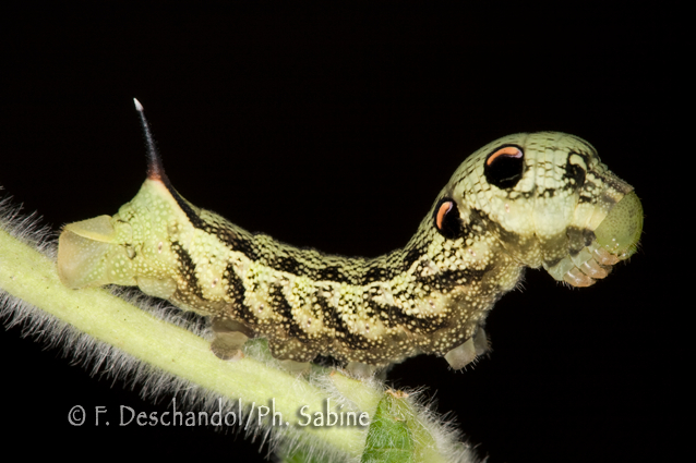 : Grand Sphinx de la Vigne (Deilephila elpenor), chenille 4ème stade, forme verte striée, Rogerville (76), France.