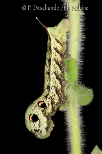 : Grand Sphinx de la Vigne (Deilephila elpenor), chenille 4ème stade, forme verte striée, Rogerville (76), France.