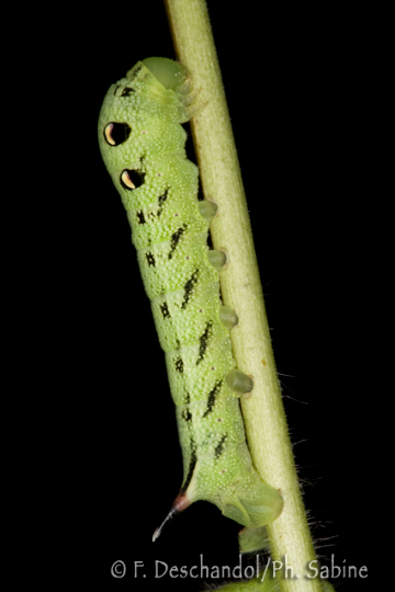 : Grand Sphinx de la Vigne (Deilephila elpenor), chenille 4ème stade, forme verte, Rogerville (76), France.