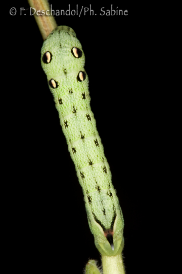 : Grand Sphinx de la Vigne (Deilephila elpenor), chenille 4ème stade, forme verte, Rogerville (76), France.