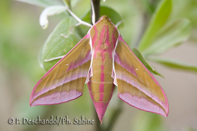 : Grand Sphinx de la Vigne (Deilephila elpenor), femelle, Rogerville (76), France.