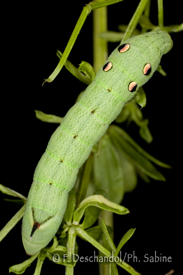 : Grand Sphinx de la Vigne (Deilephila elpenor), chenille 4ème stade, forme verte, Elevage.