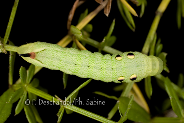 : Grand Sphinx de la Vigne (Deilephila elpenor), chenille 4ème stade, forme verte, Elevage.
