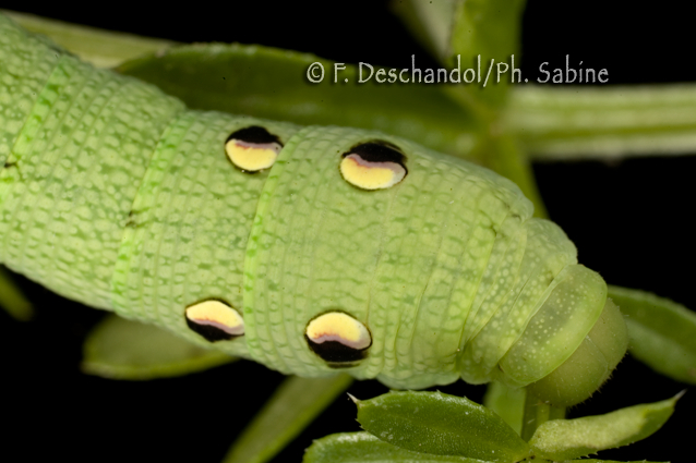 : Grand Sphinx de la Vigne (Deilephila elpenor), chenille 4ème stade, forme verte, Elevage.