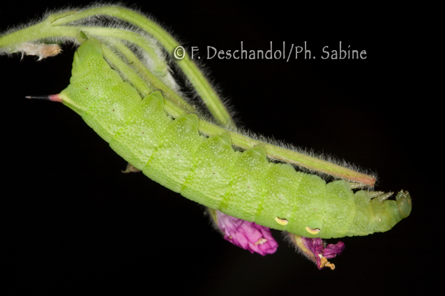 : Grand Sphinx de la Vigne (Deilephila elpenor), chenille 4ème stade, mue proche, forme verte, Rogerville (76), France.