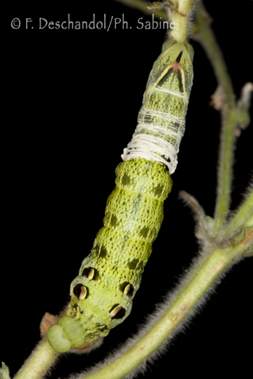 : Grand Sphinx de la Vigne (Deilephila elpenor), chenille forme verte en mue 4ème stade vers 5ème stade, Rogerville (76), France.
