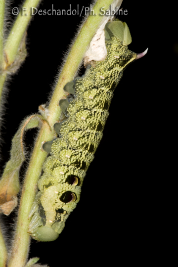 : Grand Sphinx de la Vigne (Deilephila elpenor), chenille 5ème stade, forme verte après la mue, Rogerville (76), France.