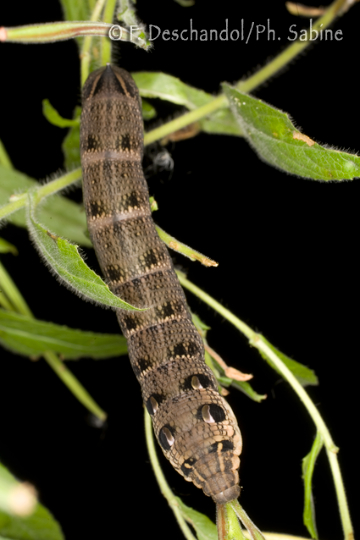 : Grand Sphinx de la Vigne (Deilephila elpenor), chenille 5ème stade, forme brune, Elevage.