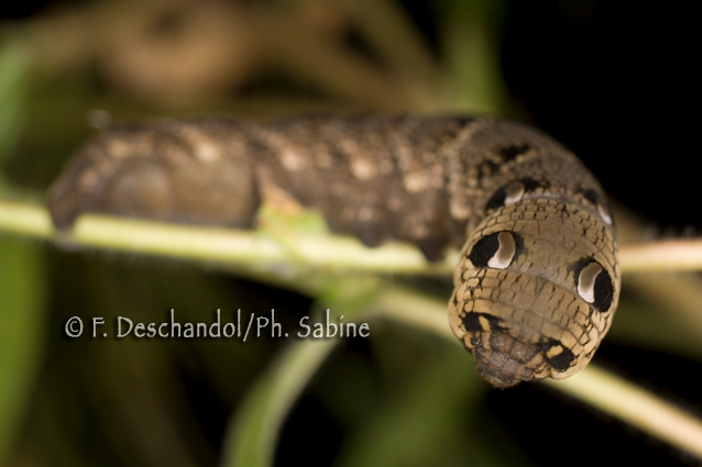 : Grand Sphinx de la Vigne (Deilephila elpenor), chenille 5ème stade, forme brune, attitude d'intimidation, Elevage.