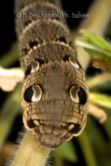 : Grand Sphinx de la Vigne (Deilephila elpenor), chenille 5ème stade, forme brune, Elevage.