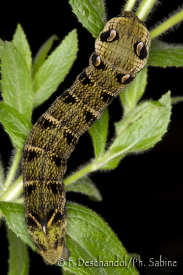 : Grand Sphinx de la Vigne (Deilephila elpenor), chenille 5ème stade, forme olive (intermédiaire), Rogerville (76), France.