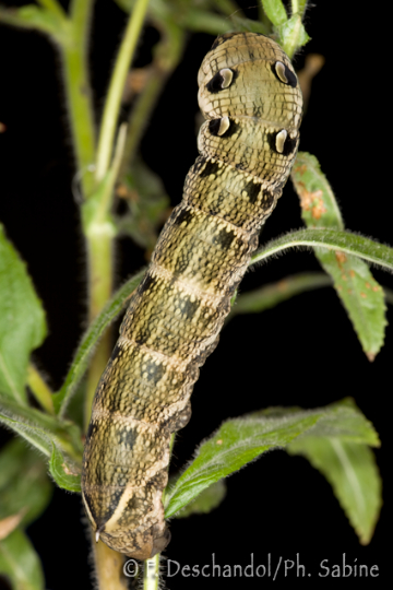 : Grand Sphinx de la Vigne (Deilephila elpenor), chenille 5ème stade, forme olive (intermédiaire), Rogerville (76), France.