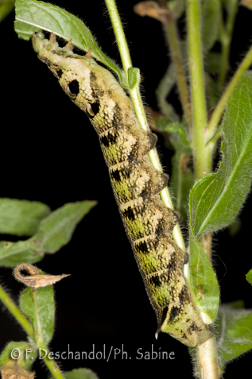 : Grand Sphinx de la Vigne (Deilephila elpenor), chenille 5ème stade, forme olive (intermédiaire), Rogerville (76), France.