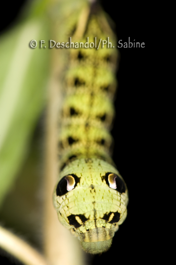 : Grand Sphinx de la Vigne (Deilephila elpenor), chenille 5ème stade, forme verte, posture d'intimidation, Rogerville (76), France.