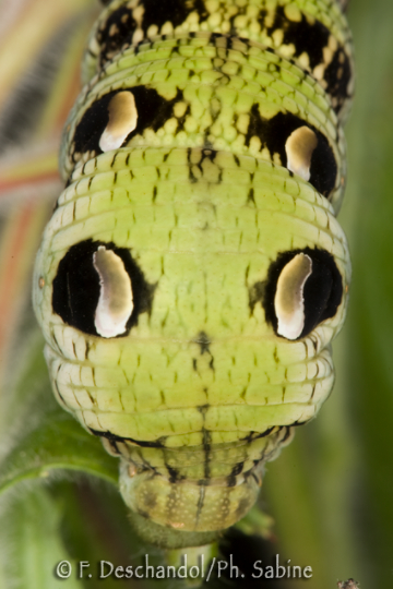 : Grand Sphinx de la Vigne (Deilephila elpenor), chenille 5ème stade, forme verte, Rogerville (76), France.