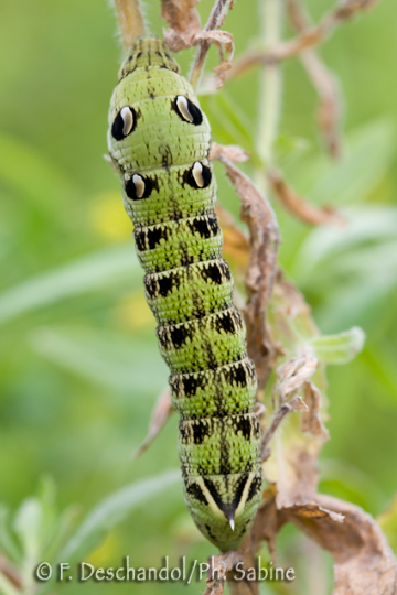 : Grand Sphinx de la Vigne (Deilephila elpenor), chenille 5ème stade, forme verte, Rogerville (76), France.