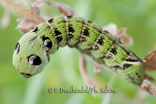 : Grand Sphinx de la Vigne (Deilephila elpenor), chenille 5ème stade, forme verte, posture d'intimidation, Rogerville (76), France.