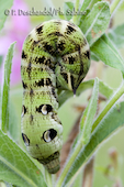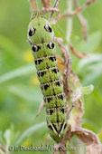 Grand Sphinx de la Vigne (Deilephila elpenor), chenille 5ème stade, forme verte, posture d'intimidation, Rogerville (76), France.